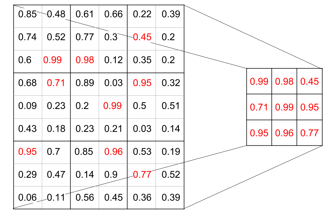 The crops are divided into a fixed number of blocks (with variable numbers of pixels for each RoI) and the pixels within each block are aggregated for example by max-pooling. This results in a fixed size feature map for each crop.
