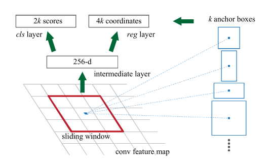 To understand how this the model works, first we need to introduce the idea of anchor boxes. We can think of these as initial bounding boxes for locations all across the image. The model has to refine these to provide bounding boxes around potential RoIs across the image. Typically we have anchor boxes with different scales and aspect ratios to enable the model to learn to predict bounding boxes effectively for objects of different sizes and shapes.